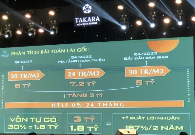 Tuy nhiên, dù dự án chưa đủ điều kiện đưa bất động sản hình thành trong tương lai vào kinh doanh nhưng nhiều diễn đàn bất động sản chào bán dưới tên gọi viết tắt Takara, Takara Hoà Bình hoặc TKR... Giới thiệu về dự án, trên nhiều website không ngừng “tung hô” bằng hàng loạt những lời có cánh như: Tựa như mảnh ghép tuyệt mỹ của viên kim cương thô lớn nhất thế giới, sở hữu thế đất “tựa sơn hướng thủy”, Takara tựa viên kim cương xanh quý hiếm mà ai cũng khao khát lưu giữ – như một di sản vô giá không chỉ ở hiện tại, mà còn cả tương lai, bừng sáng giữa một vùng “non xanh thủy tú”, Takara Hoa Binh Resort mang dáng vẻ một tuyệt tác kết hợp tinh hoa thiết kế Nhật Bản…