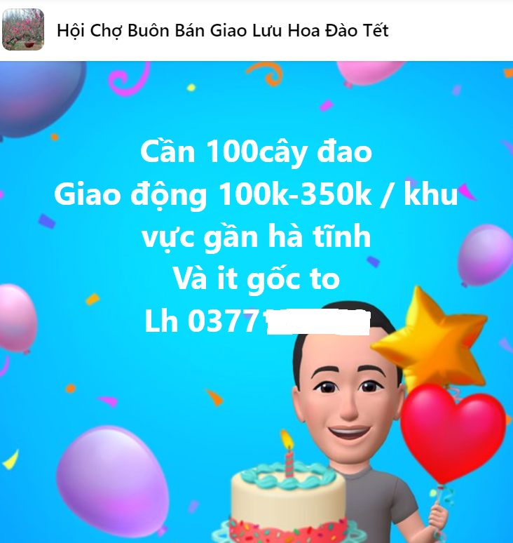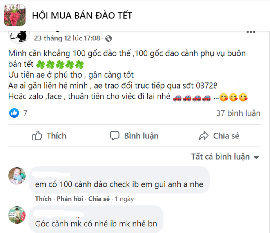 Tại nhóm này, nick name “Quyen Pham” đăng cần mua 100 cây đào giá dao động từ 100.000 – 350.000 đồng, khu vực Hà Tĩnh… Ngay sau đó thu hút rất nhiều lượt bình luận từ các nhà vườn như: Nhà vườn Xưa Tám bán buôn đào thế gốc 2 – 3 năm có cả đào bích đỏ và đào phai đã đôn gốc đảm bảo không héo khi đánh lên.