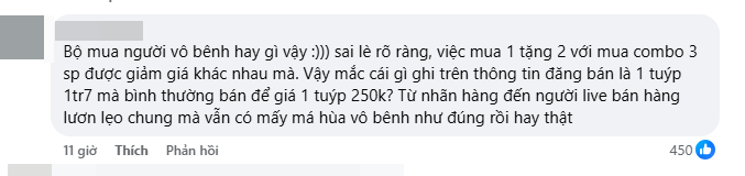 "Sai lè rõ ràng, việc mua 1 tặng 2 với mua combo 3 sản phẩm được giảm giá khác nhau mà. Vậy mắc cái gì ghi trên thông tin đăng bán là 1 tuýp 1,7 triệu mà bình thường bán để giá 1 tuýp 250k? Từ nhãn hàng đến người live bán hàng lươn lẹo mà vẫn có người hùa vào bênh hay thật", một netizen bình luận.