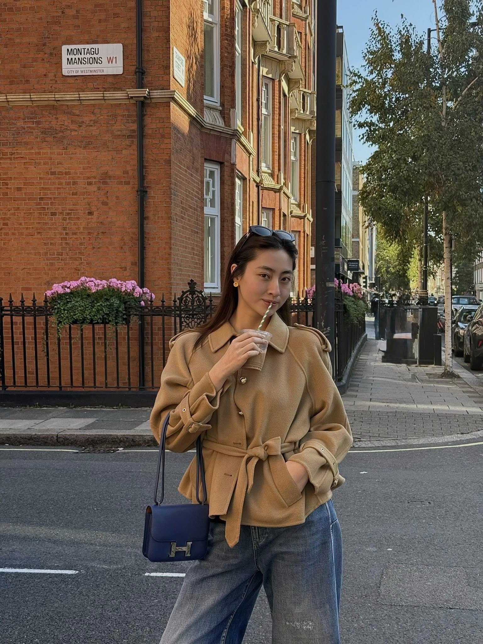 Giữa đường phố Marylebone, London, nàng hậu tự tin "sống ảo" với trang phục thoải mái nhưng không kém phần sang chảnh gồm áo khoáng dáng ngắn và quần jeans, phối túi Hermès.