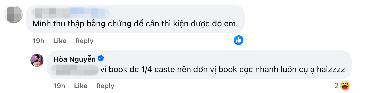Phía dưới bài đăng, Hoà Minzy còn hé lộ thêm bên phía tổ chức sự kiện vì thấy cát-xê rẻ hơn 1/4 thông thường nên đã vội vàng đặt cọc.