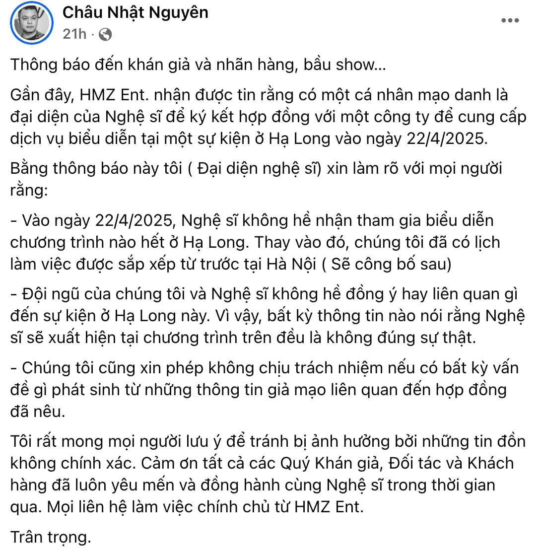 Quản lý Hòa Minzy lên tiếng về việc có cá nhân mạo danh là đại diện của nghệ sĩ để ký hợp đồng nhận show biểu diễn tại Hạ Long vào ngày 22/4/2025 tới đây.