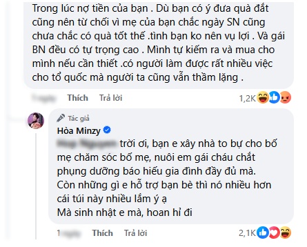 Trước ý kiến gay gắt này của một cư dân mạng, nữ ca sĩ cũng nhanh chóng đáp trả: "Trời ơi, bạn em xây nhà to bự cho bố mẹ chăm sóc bố mẹ, nuôi em gái cháu chắt phụng dưỡng báo hiếu gia đình đầy đủ mà. Còn những gì e hỗ trợ bạn bè thì nó nhiều hơn cái túi này nhiều lắm ý ạ. Mà sinh nhật e mà, hoan hỉ đi."