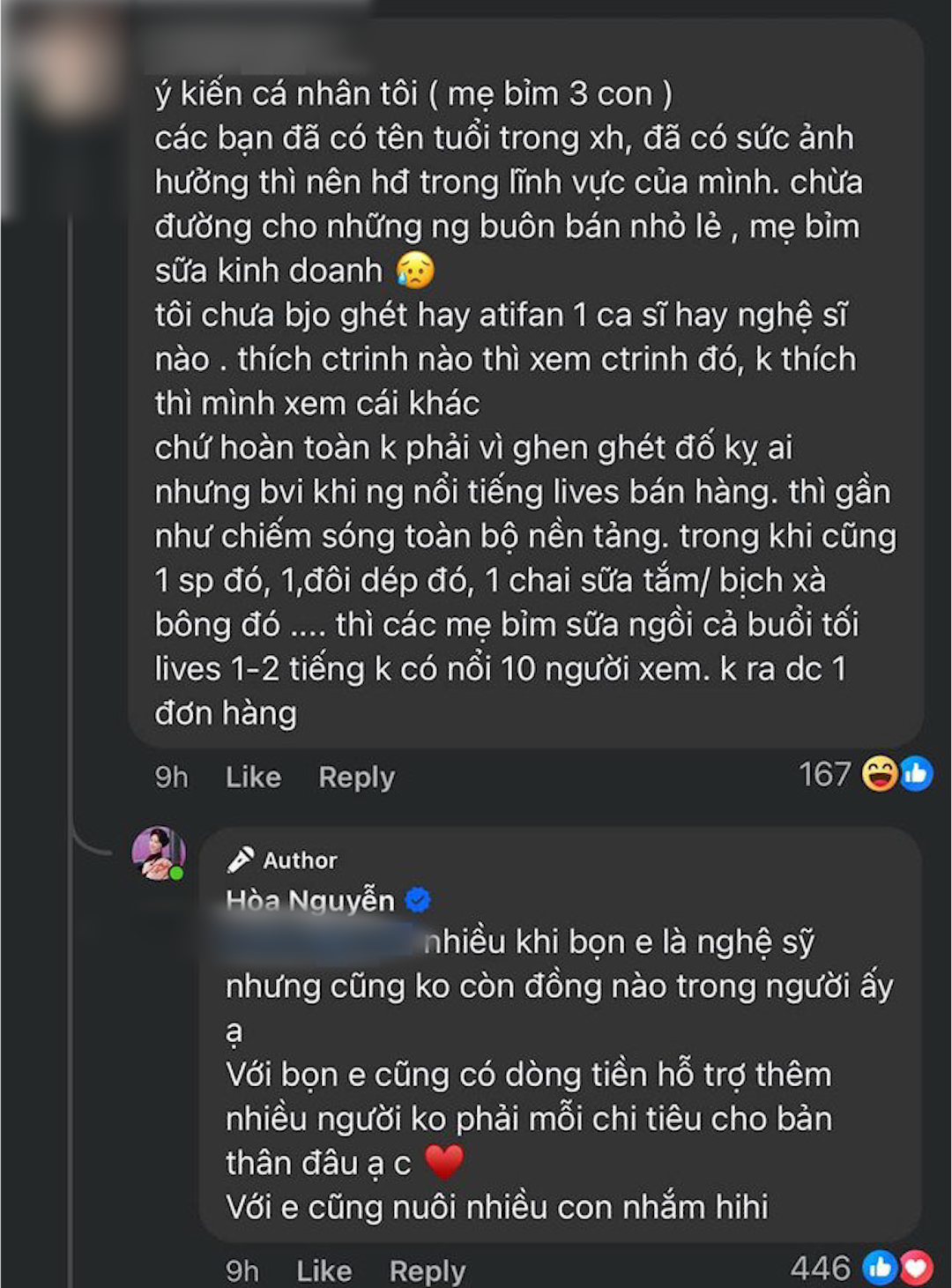Tôi chưa bao giờ ghét hay anti một ca sĩ hay nghệ sĩ nào. Thích chương trình nào thì xem chương trình đó, không thích thì mình xem cái khác. Chứ hoàn toàn không phải vì ghen ghét đố kỵ ai nhưng bởi vì khi người nổi tiếng live bán hàng thì gần như chiếm sóng toàn bộ nền tảng. Trong khi cũng một sản phẩm đó thì các mẹ bỉm sữa ngồi cả tối live 1-2 tiếng không có nổi 10 người xem. Không ra được một đơn hàng".