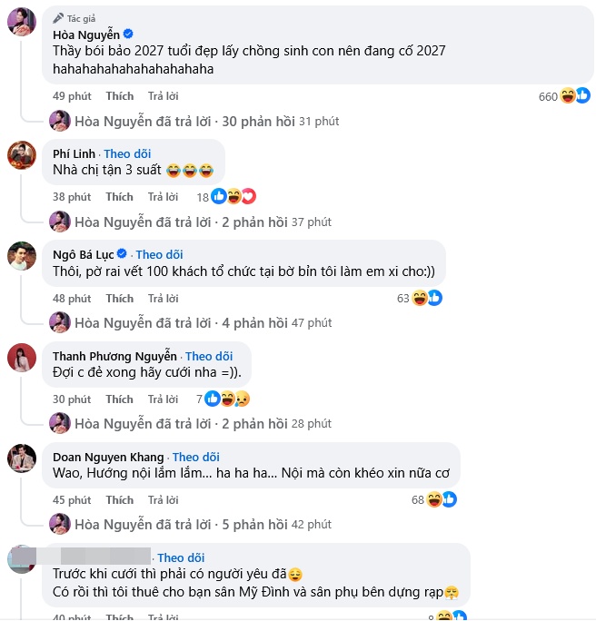 Chia sẻ của nữ ca sĩ lập tức hút 17 nghìn lượt thích và hàng trăm lượt bình luận gây xôn xao. Theo đó, người đẹp lên kế hoạch về đám cưới của bản thân nếu tổ chức dự định sẽ làm ở sân vận động vì quá nhiều bạn bè, khách mời... để đi ăn đám cưới. Ngoài ra, người đẹp còn tiết lộ năm 2027 sẽ là năm hợp tuổi của các chị em sinh năm 1995.