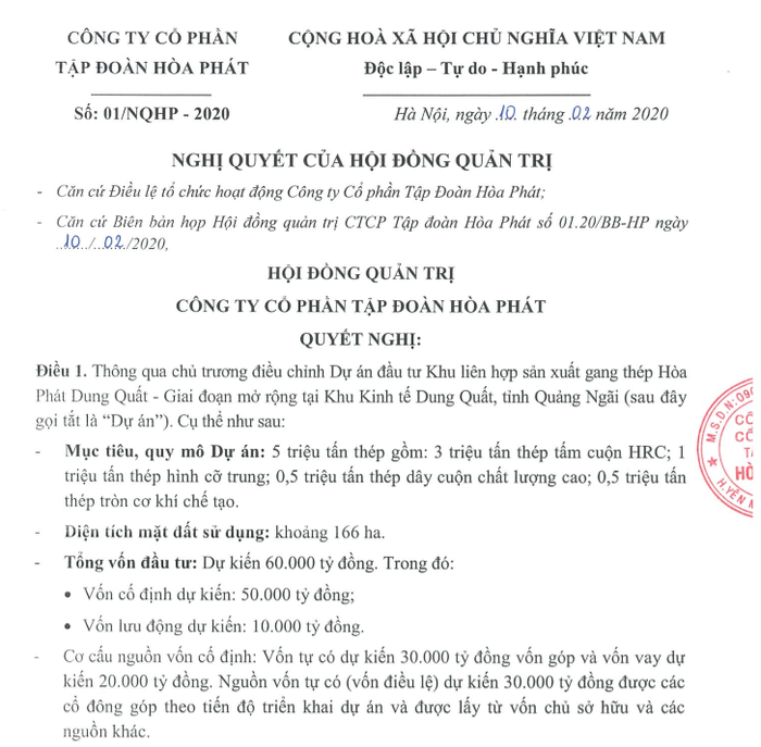 Dự án khu liên hợp sản xuất gang thép Hòa Phát Dung Quất (Khu kinh tế Dung Quất, Quảng Ngãi) là Tại cuộc gặp chuyên viên phân tích cuối tháng 12/2019, lãnh đạo công ty khẳng định đã thu xếp gần như toàn bộ vốn đầu tư 52.000 tỷ đồng, trong đó Hòa Phát rót khoảng 30.000 tỷ đồng và vay nợ 20.000 tỷ đồng từ Vietcombank và VietinBank. Số 2.000 tỷ đồng còn lại tập đoàn sẽ bổ sung từ nguồn vốn khác nhờ có lãi hàng nghìn tỷ đồng mỗi năm. Thời gian khấu hao bình quân là 12 năm.