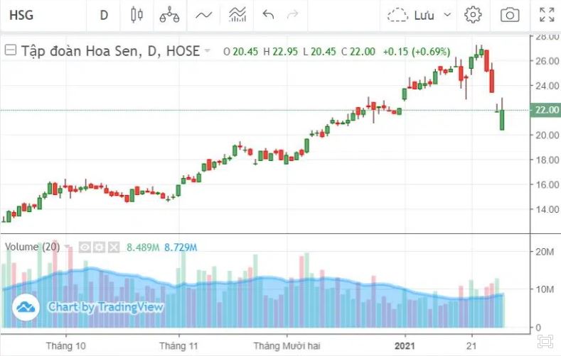 Với diễn biến tiêu cực của thị trường, cổ phiếu HSG đã có 3 phiên giảm mạnh từ 26.850 đồng/cp tại ngày 25/1 xuống còn 21.850 đồng/cp ngày 28/1, tương đương mức giảm 18,6%. Cổ phiếu HSG giảm sàn trong hai phiên 27 - 28/1.