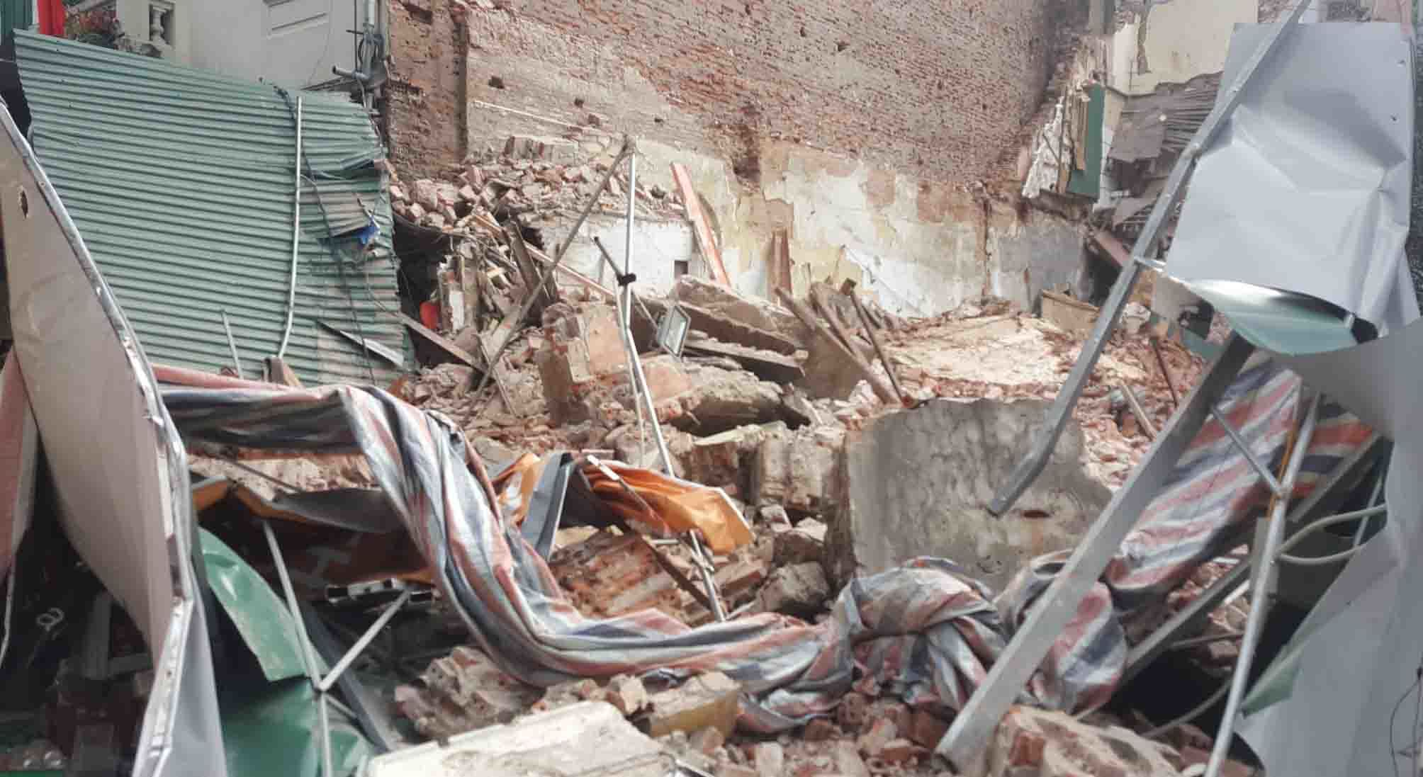 Trở lại hiện trường vụ sập tường, tại hiện trường, bức tường nhà bị đổ trong cảnh tan hoang, gạch từ căn nhà đổ vỡ đè lên phần tường rào bao quanh công trường bên cạnh, đồng thời làm hư hại mái tôn của 1 cửa hàng phía trước.