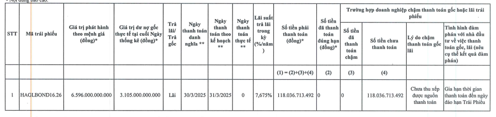 Được biết, lô trái phiếu HAGLBOND16.26 được phát hành vào ngày 30/6/2016, kỳ hạn 10 năm, với tổng giá trị 6.596 tỷ đồng. Đây là trái phiếu không chuyển đổi, không kèm chứng quyền, có tài sản đảm bảo. Lãi suất phát hành là 9,7%/năm, trả lãi định kỳ 3 tháng/lần, sau đó áp dụng lãi suất thả nổi. Trái chủ duy nhất là Ngân hàng TMCP Đầu tư và Phát triển Việt Nam (HoSE: BID). Mục đích phát hành nhằm bổ sung vốn cho các dự án đầu tư và tái cơ cấu nợ vay của công ty.