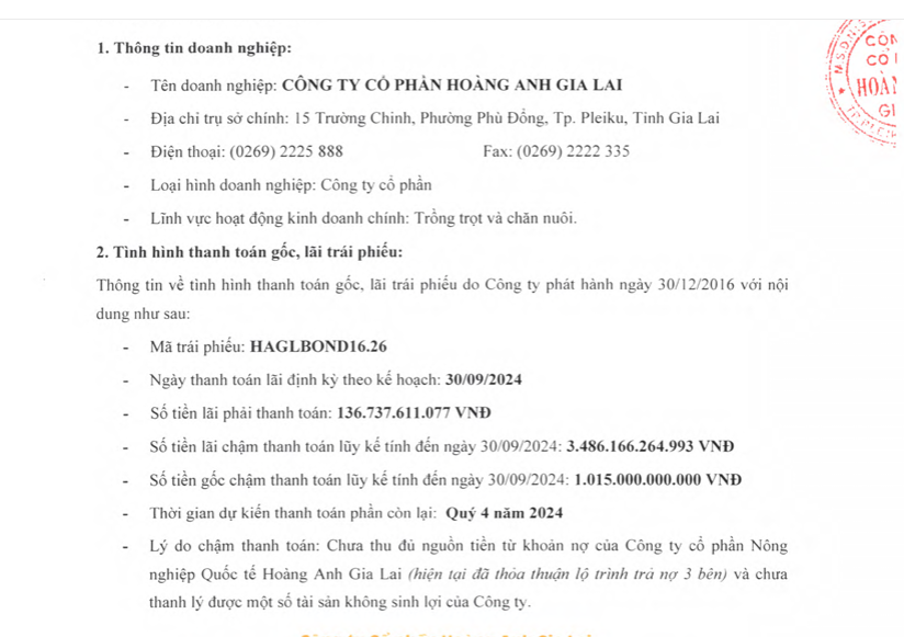 Công ty CP Hoàng Anh Gia Lai tiếp tục chậm thanh toán lãi trái phiếu HAGLBOND16.26 số tiền gần 137 tỷ đồng do chưa thu đủ nguồn tiền từ khoản nợ của CTCP Nông nghiệp Quốc tế Hoàng Anh Gia Lai.