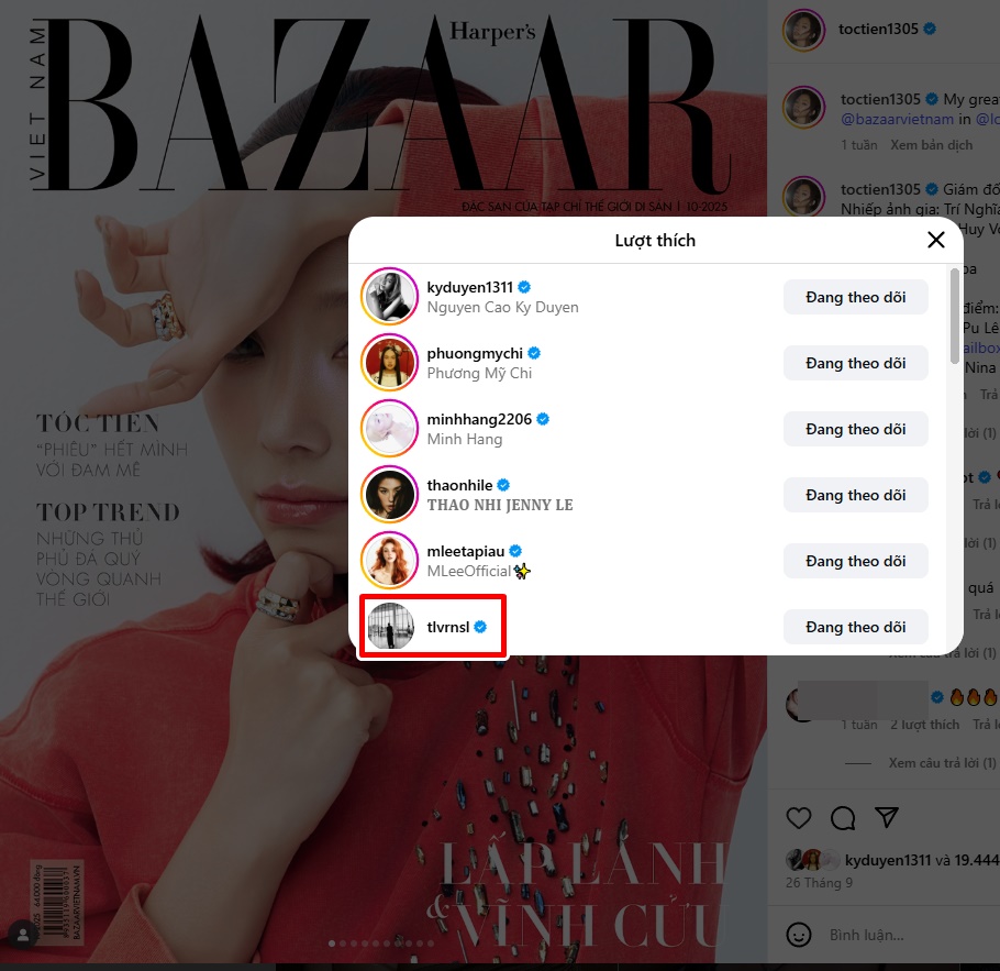 Hoàng Touliver liên tục "thả tim" ảnh của Tóc Tiên trên Instagram.