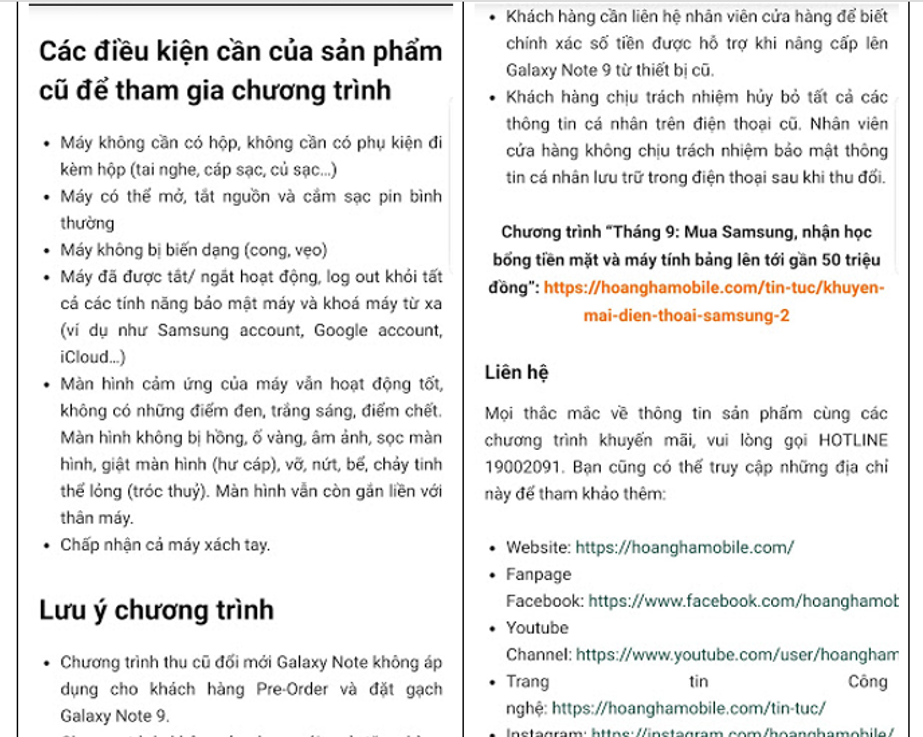 Theo phản ánh của một số bạn đọc, vừa qua, hệ thống siêu thị điện thoại Hoanghamobile có dấu hiệu cung cấp thông tin “mập mờ”, thiếu rõ ràng từ đó gây phiền phức và tạo bức xúc cho khách hàng. Cụ thể, đầu tháng 9/2018, hệ thống siêu thị điện thoại Hoanghamobile triển khai thực hiện chương trình “Thu cũ, đổi mới Galaxy Note 9 tiết kiệm tới 16 triệu đồng”. Nội dung trên website của Hoanghamobile ghi rõ: Những khách hàng sở hữu các dòng điện thoại thông minh từ các hãng điện thoại lớn như Sam Sung, Apple, Nokia… (có danh sách kèm theo) sẽ có thể trực tiếp đến cửa hàng của Hoanghamobile để nâng cấp Galaxy Note 9. Nhân viên sẽ định giá thu đổi nhằm giúp khách hàng có được dòng điện thoại cao cấp nhất của Sam Sung với khoản phí chênh lệch ít nhất.