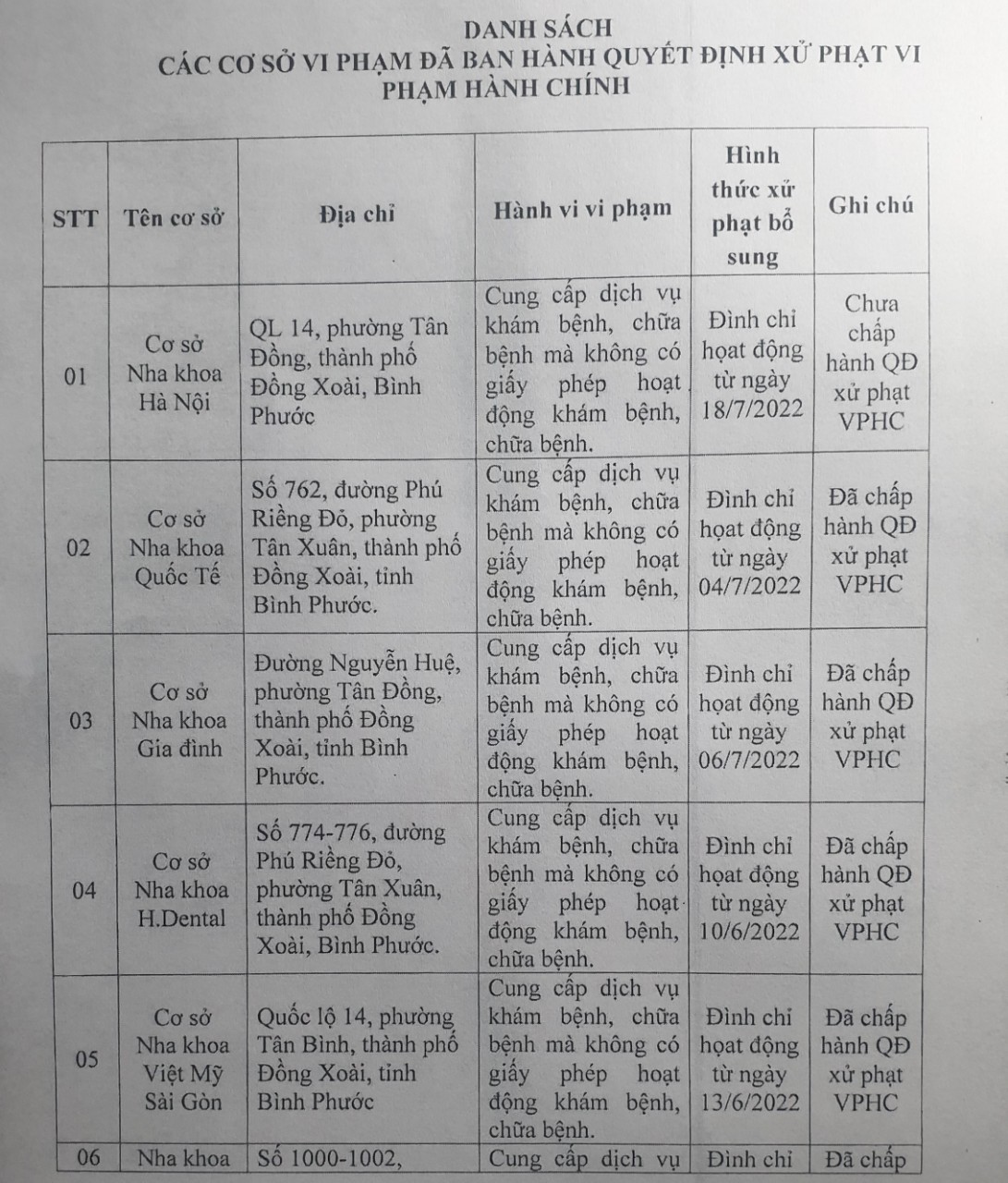 Ngày 6/9, Sở Y tế tỉnh Bình Phước đã công khai danh sách các cơ sở vi phạm hành chính trong lĩnh vực hành nghề y, dược tư nhân trên địa bàn tỉnh.