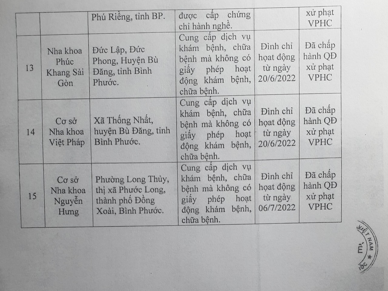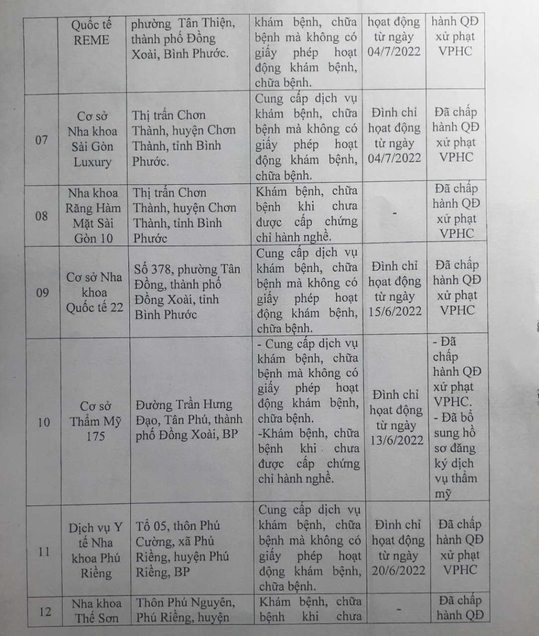 Trong số 15 cơ sở vi phạm nêu trên, Thanh tra Sở Y tế tỉnh Bình Phước đã đình chỉ hoạt động 12 cơ sở nha khoa và 1 cơ sở thẩm mỹ.