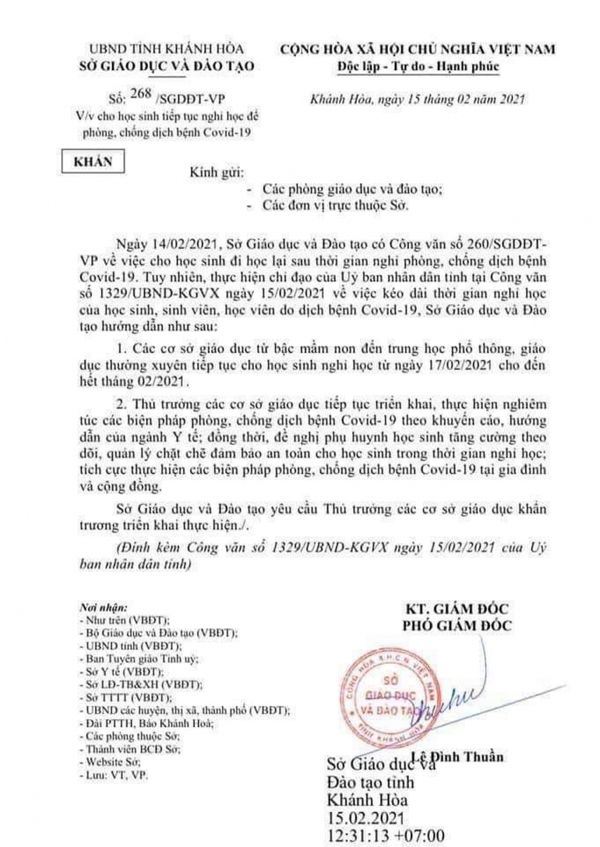 Cùng ngày, ông Võ Hoàn Hải, Giám đốc Sở Giáo dục và Đào tạo tỉnh Khánh Hòa cho biết, ngày 17/2, học sinh toàn tỉnh vẫn đi học bình thường, còn công văn nghỉ học lan truyền trên các trang mạng là giả mạo.