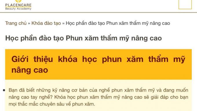 Không chỉ dừng lại ở đó, trên website, Học viện thẩm mỹ Placencare quảng cáo rất nhiều lời lẽ có cánh để nhằm câu kéo học viên như: “ phun xăm thẩm mỹ là một trong số những công việc được nhiều người theo đuổi vì nó mang tính thời thượng, không những thế nó còn đem lại nguồn thu nhập khủng có thể lên đến 30.000.000 VNĐ/ tháng. Học phun xăm thẩm mỹ ở Placencare chỉ từ 2 – 3 tháng là có thể làm việc ở rất nhiều thẩm mỹ viện ở trong và ngoài nước”.