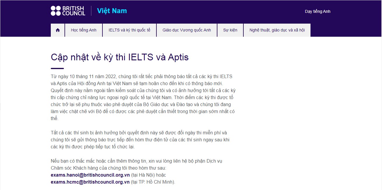 Nội dung cụ thể như sau: "Chúng tôi rất tiếc phải thông báo tất cả các kỳ thi IELTS của Hội đồng Anh tại Việt Nam sẽ tạm hoãn cho đến khi có thông báo mới. Vì vậy, kỳ thi của bạn vào ngày 10/11/2022 sẽ bị hủy.