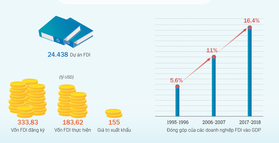 Biểu đồ  của doanh nghiệp  nguồn vốn FDI đầu tư vào Việt Nam đóng góp cho GDP