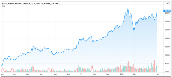 Sau 3 phiên tăng điểm liên tiếp, từ 25/3 đến 29/9, kết phiên 30/3, cổ phiếu STB của Ngân hàng TMCP Sài Gòn Thương Tín (HoSE: STB) tăng trần lên mức giá 20.500 đồng/cổ phiếu với khối lượng giao dịch "khủng".