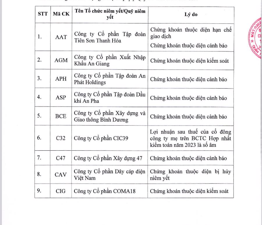 Phần lớn danh sách của HOSE tiếp tục là các cổ phiếu thuộc diện cảnh báo, kiểm soát như AGM, APH, ASP, CKG, CRE, DAG, DLG, DTL, DXV, EVG, FDC, GMC, HAG, HBC, HNG, HVN, ITA, JVC, KPF, PIT, PSH... Trong đó, một số cổ phiếu còn thuộc diện hạn chế giao dịch như AAT, DAG, HVN, LEC, SRF, TNA, TTF, TVB, VAF, VNE, hay thuộc diện đình chỉ giao dịch như SJF.