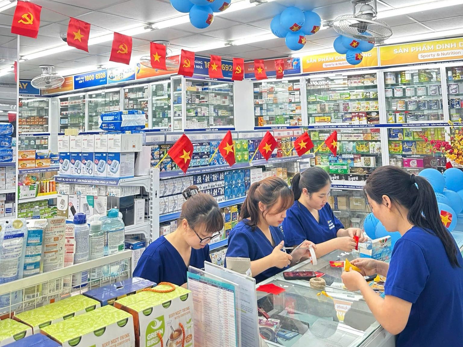 Điều đặc biệt là chính các dược sĩ, nhân viên tại từng nhà thuốc đã tự tay trang trí cờ, hoa và chuẩn bị không gian chào mừng dịp lễ lớn. Không chỉ là một hoạt động trang trí thông thường, đây còn là cách họ thể hiện tình yêu đất nước, niềm tự hào khi được đóng góp một phần nhỏ cho cộng đồng trong hành trình phát triển của đất nước hôm nay.