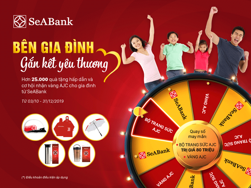 Nhằm tri ân khách hàng đã tin tưởng sử dụng sản phẩm dịch vụ, Ngân hàng TMCP Đông Nam Á (SeABank) triển khai chương trình khuyến mại “Bên gia đình gắn kết yêu thương” với hơn 25.000 quà tặng hấp dẫn là ô, áo mưa, mũ bảo hiểm, bình giữ nhiệt Lock&Lock và cốc giữ nhiệt, vàng AJC, bộ trang sức vàng AJC trị giá 80 triệu đồng. Tổng giá trị quà tặng lên tới hơn 3 tỷ đồng.