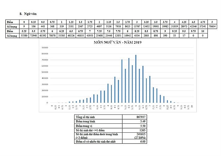 Trong đó, dẫn đầu về số lượng thí sinh bị điểm liệt là Ngữ văn với 1.265 thí sinh có mức điểm dưới 1. Với số điểm liệt như năm nay đã tăng gấp 7 lần so với năm 2018 (chỉ có 181 em bị điểm liệt). Theo một số giáo viên, năm nay số lượng điểm liệt môn Ngữ văn là bất ngờ bởi vì môn Văn thường là môn “gánh điểm” cho các môn khác nhưng năm nay ngoài điểm liệt thì số lượng thí sinh có mức điểm từ 1-2 cũng có tới hơn 7.000 em.
