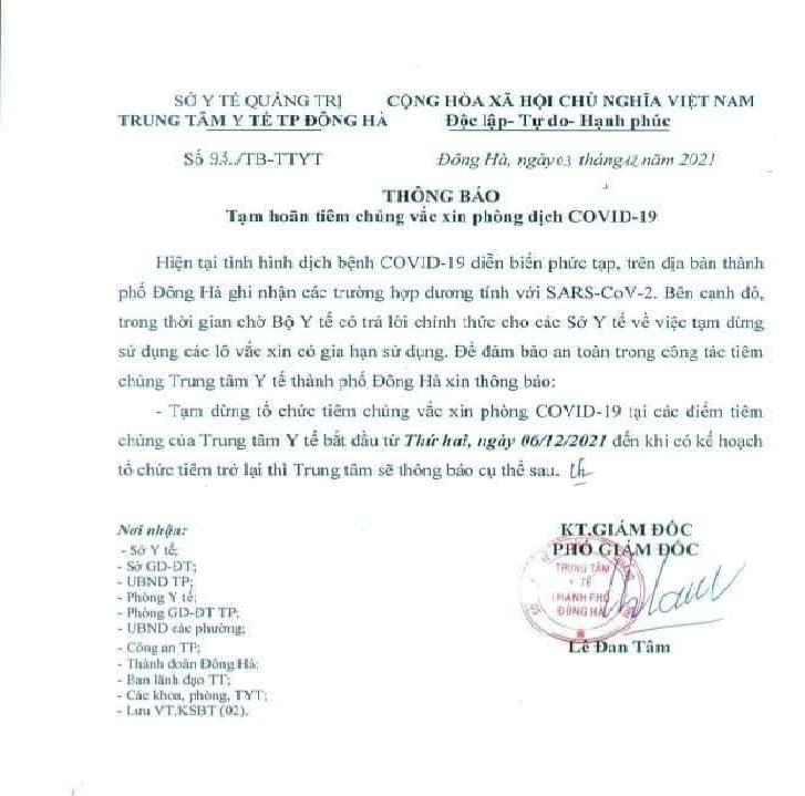Trước đó, trong khi chờ Bộ Y tế trả lời chính thức, có tính pháp lý về lô vắc xin được gia hạn sử dụng, Trung tâm Y tế TP Đông Hà đã thông báo tạm dừng tiêm vaccine phòng Covid-19 tại các điểm tiêm chủng.