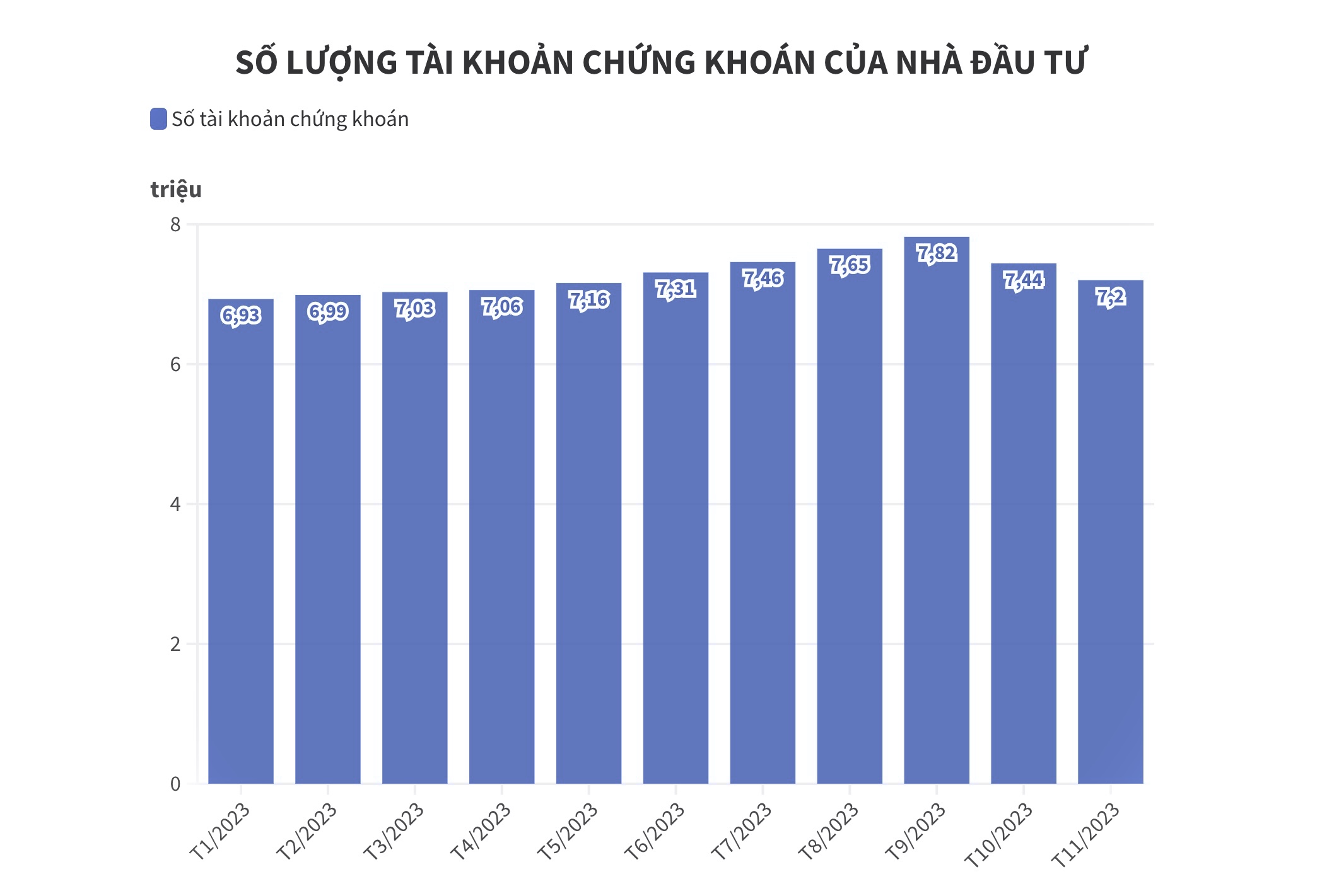 Theo thông tin từ Tổng công ty lưu ký và bù trừ chứng khoán Việt Nam (VSDC), tính đến ngày 30/11/2023, tổng số tài khoản giao dịch chứng khoán trong nước là hơn 7,2 triệu.