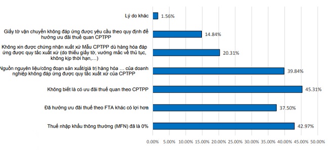 Đi sâu vào phân tích, lý do lớn nhất khiến doanh nghiệp chưa nhận được lợi ích từ CPTPP là do “không biết là có ưu đãi thuế quan theo CPTPP”, với tỷ lệ lên tới 45,31%