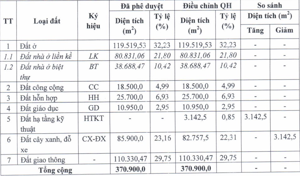 Cơ cấu sử dụng đất thay đổi cụ thể như sau: Đất hạ tầng kỹ thuật điều chỉnh tăng thêm 3.142,5 m2 diện tích tăng thêm này được lấy từ đất cây xanh và bãi đỗ xe. Như vậy đồng nghĩa với diện tích đất cây xanh và bãi đỗ xe sẽ giảm từ 85.900 m2 xuống còn 82.757,5 m2 (tức giảm 3.142,5 m2).