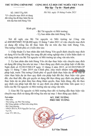 Mới đây, Thủ tướng Chính phủ vừa ban hành công văn số 1085/TTg-NN về việc chấp thuận việc UBND tỉnh Hưng Yên chuyển mục đích sử dụng 65,6 ha đất trồng lúa sang đất phi nông nghiệp để thưc hiện dự án trên địa bàn tỉnh.