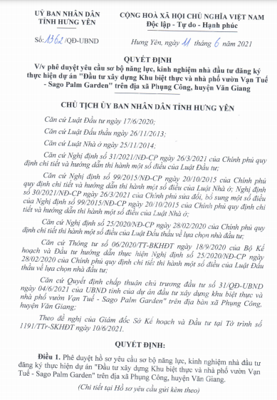 UBND tỉnh Hưng Yên vừa ban hành quyết định số 1362/QĐ-UBND về việc phê duyệt yêu cầu sơ bộ năng lực, kinh nghiệm nhà đầu tư đăng ký thực hiện dự án “Đầu tư xây dựng Khu biệt thực và nhà phố vườn Vạn Tuế - Sago Palm Garden” trên địa bàn xã Phụng Công, huyện Văn Giang. Theo đó, UBND tỉnh phê duyệt với yêu cầu được đề xuất và giao cơ quan Sở Kế hoạch và Đầu tư tỉnh Hưng Yên tổ chức các công việc liên quan theo đúng quy định của pháp luật hiện hành.