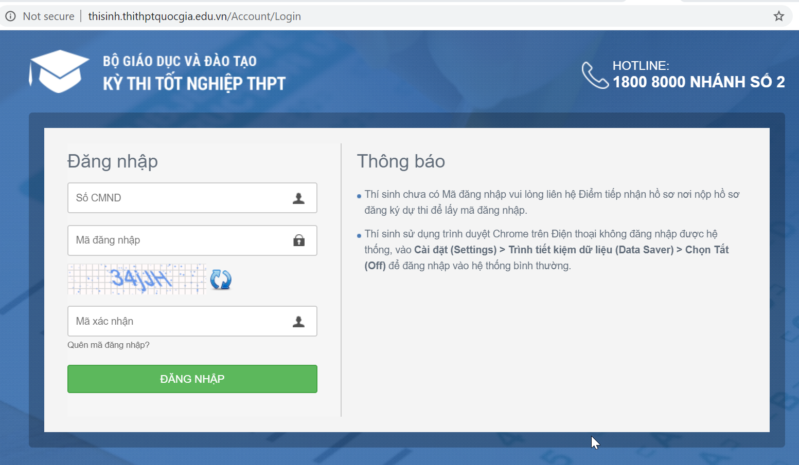 Bước 2: Nhập Số CMND > Nhập Mã đăng nhập > Nhập Mã xác nhận > Chọn Đăng nhập là bạn sẽ biết được điểm thi THPT quốc gia 2020 của mình.
