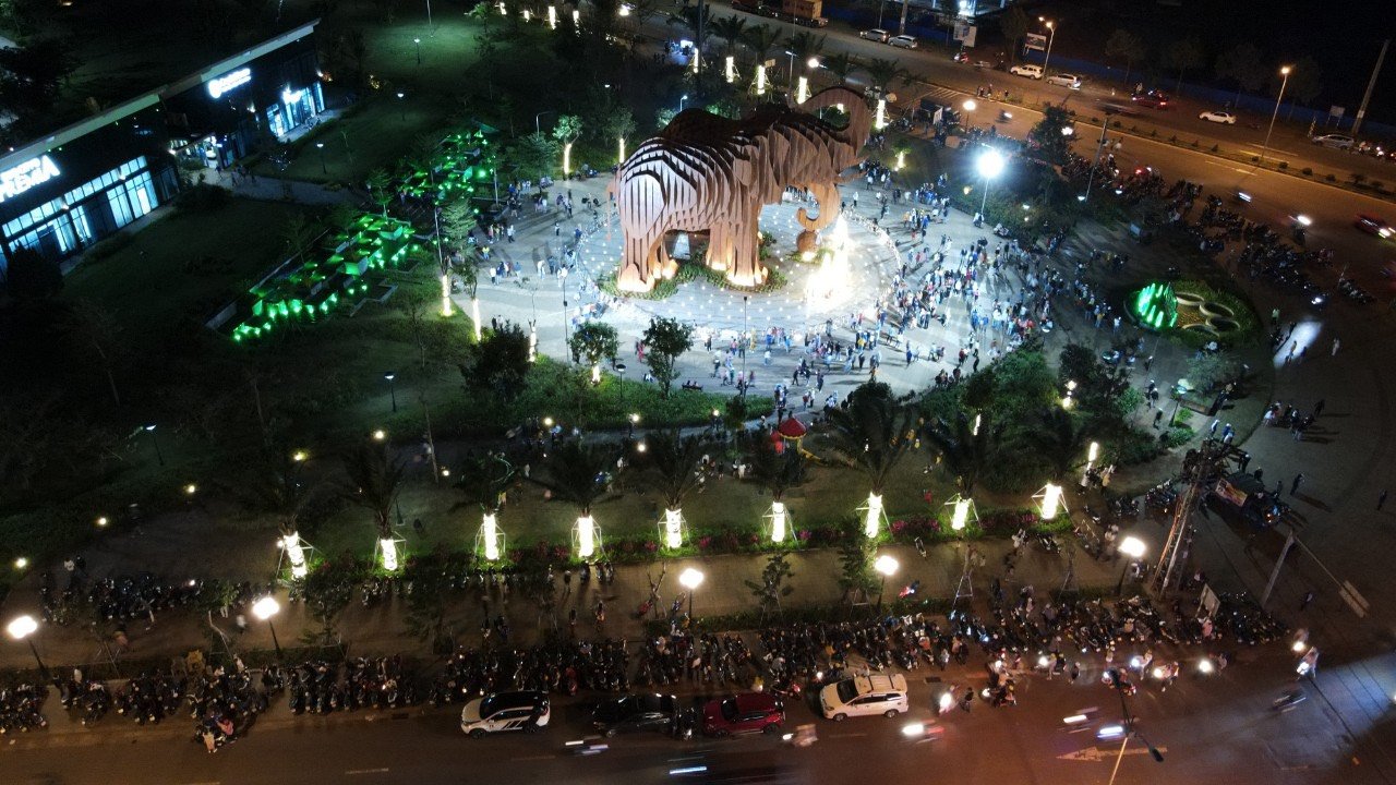 Nhìn từ trên cao, Song tượng phát sáng rực rỡ như linh hồn của biểu tượng Tây Nguyên.