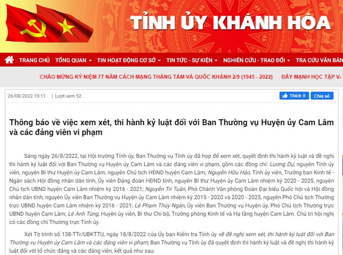 Ngày 26/8, Ban thường vụ Tỉnh ủy Khánh Hòa quyết định thi hành kỷ luật bằng hình thức cảnh cáo đối với Ban Thường vụ Huyện ủy Cam Lâm nhiệm kỳ 2015 - 2020 và nhiệm kỳ 2020 - 2025.