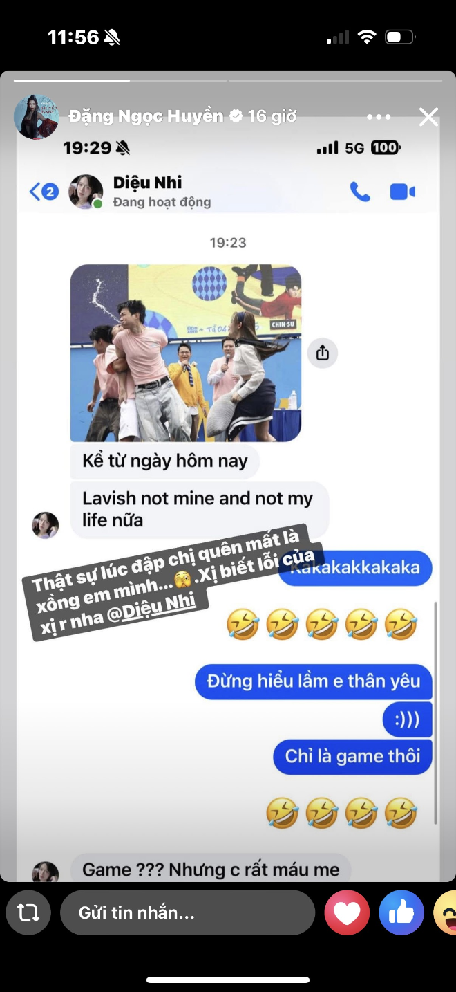 “Lúc đó chị quên mất đây là chồng em… chị biết lỗi rồi nha Diệu Nhi,” Huyền Baby hóm hỉnh viết. Đáp lại, Diệu Nhi ngay lập tức thể hiện sự “cao tay” trong màn tung hứng bằng một câu nhắn cực duyên: “Kể từ hôm nay, Lavish not mine and not my life nữa.”