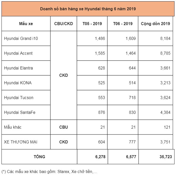 Tháng 6, Grand i10 tiếp tục chiếm ngôi đầu bảng với 1,609 xe, tăng nhẹ so với tháng trước đó, đạt 8,184 xe cộng dồn. Accent xếp thứ 2 với 1,464 xe, cộng dồn 6 tháng đầu năm đạt 8,785 xe, là mẫu xe bán chạy nhất của Hyundai Thành Công.
