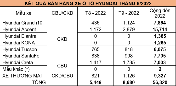 Hyundai Accent quay trở lại là mẫu xe bán chạy nhất của Hyundai với 2.879 xe bán ra, tăng trưởng 145,6% so với tháng 8. Hyundai Creta ghi nhận doanh số kỉ lục kể từ khi được bán tại thị trường Việt Nam với 1.735 xe tới tay khách hàng, tăng trưởng 22,4% so với tháng 8, đứng ở vị trí thứ 2 trong bảng doanh số xe Hyundai bán tại Việt Nam. Hyundai Grand i10 đứng ở vị trí thứ 3 với 1.124 xe bán ra, tăng trưởng 157,8% so với tháng trước.