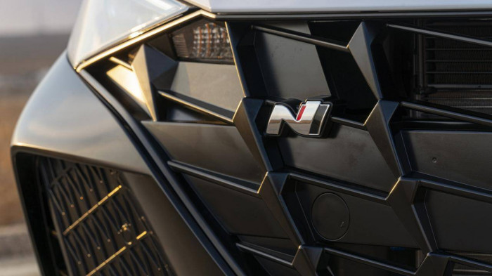 Hyundai Elantra N 2022 trang bị logo N bên phải lưới tản nhiệt, trong khi mặt ca-lăng sơn tối màu mang đến vẻ thể thao cho phần đầu xe.