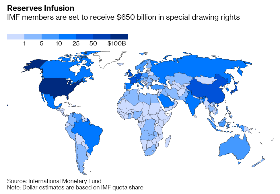 Việc phân bổ SDR sẽ có hiệu lực vào ngày 23 tháng 8 cho tất cả 190 thành viên của IMF theo tỷ lệ hạn ngạch, và khoảng 70% sẽ dành cho Nhóm 20 nền kinh tế lớn nhất, chỉ 3% dành cho các quốc gia có thu nhập thấp. Nhìn chung, 58% SDR dành cho các nền kinh tế tiên tiến, trong đó 42% dành cho các nền kinh tế mới nổi và đang phát triển. Như vậy, trong số 650 tỷ USD, khoảng 21 tỷ USD dành cho các nước thu nhập thấp và 212 tỷ USD cho các thị trường mới nổi và các nước đang phát triển khác, không tính Trung Quốc, theo tính toán của Bộ Tài chính Mỹ.