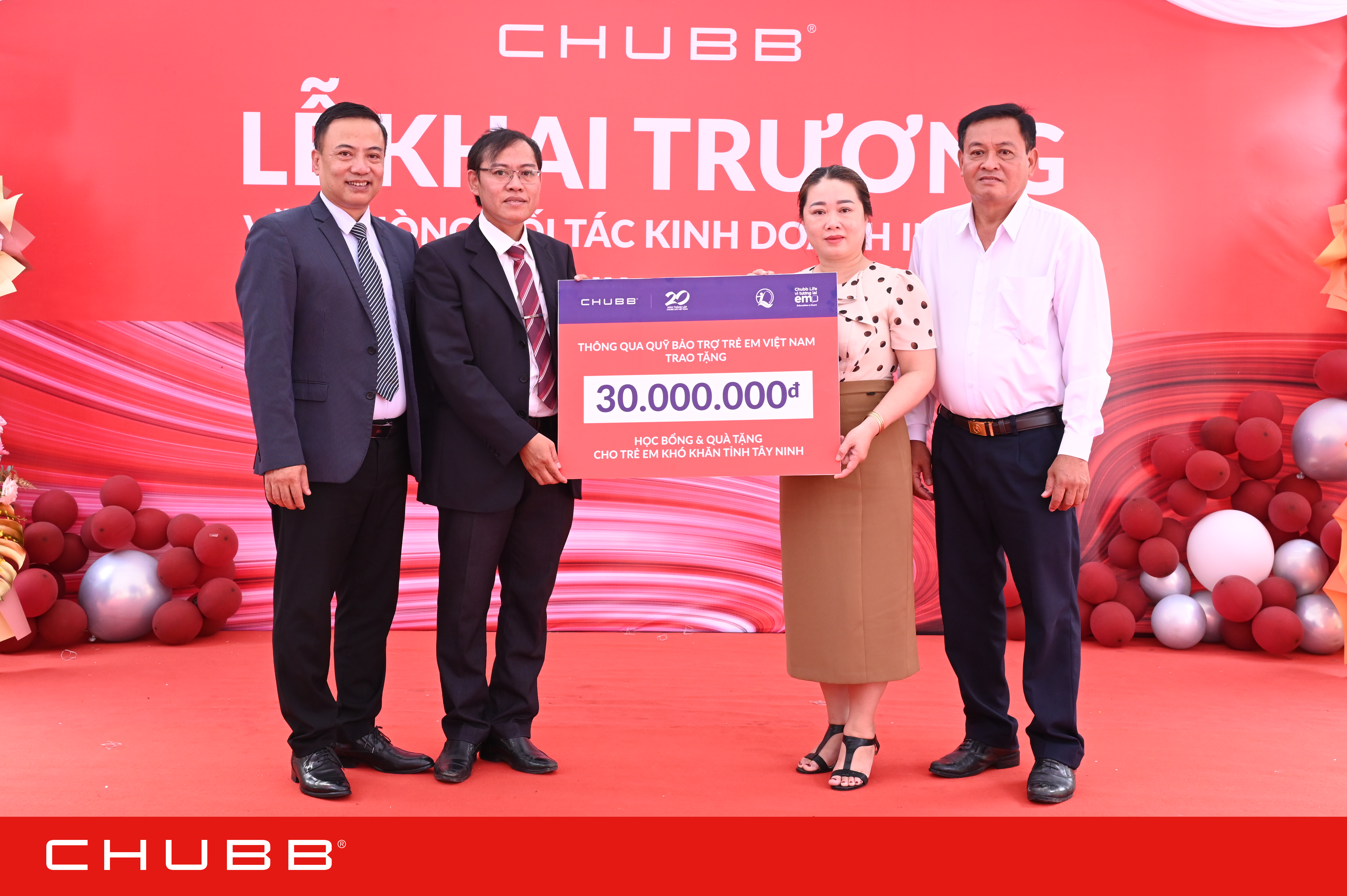 Không chỉ chú trọng phát triển kinh doanh, Chubb Life Việt Nam còn kiên định với cam kết trách nhiệm xã hội. Nhân dịp khai trương văn phòng đối tác kinh doanh Infinity Long An 1 và động viên các em học sinh trong mùa tựu trường năm học 2025-2026, công ty đã trao 30 suất học bổng “Chubb Life - Vì Tương Lai Em” (mỗi suất trị giá 1 triệu đồng) cho học sinh có hoàn cảnh khó khăn tại địa phương.