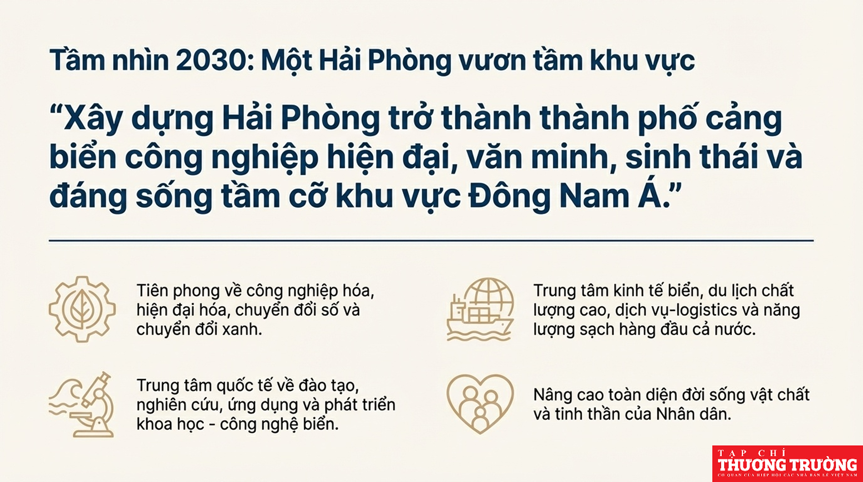 Nghị quyết 73 và 74 đã đặt mục tiêu đưa Hải Phòng trở thành trung tâm kinh tế biển, công nghiệp hiện đại và cảng biển logistics hàng đầu khu vực Đông Nam Á; nhấn mạnh việc đẩy mạnh chuyển đổi số, tăng trưởng xanh và nâng cao đời sống nhân dân thông qua các chính sách an sinh xã hội tiên phong.