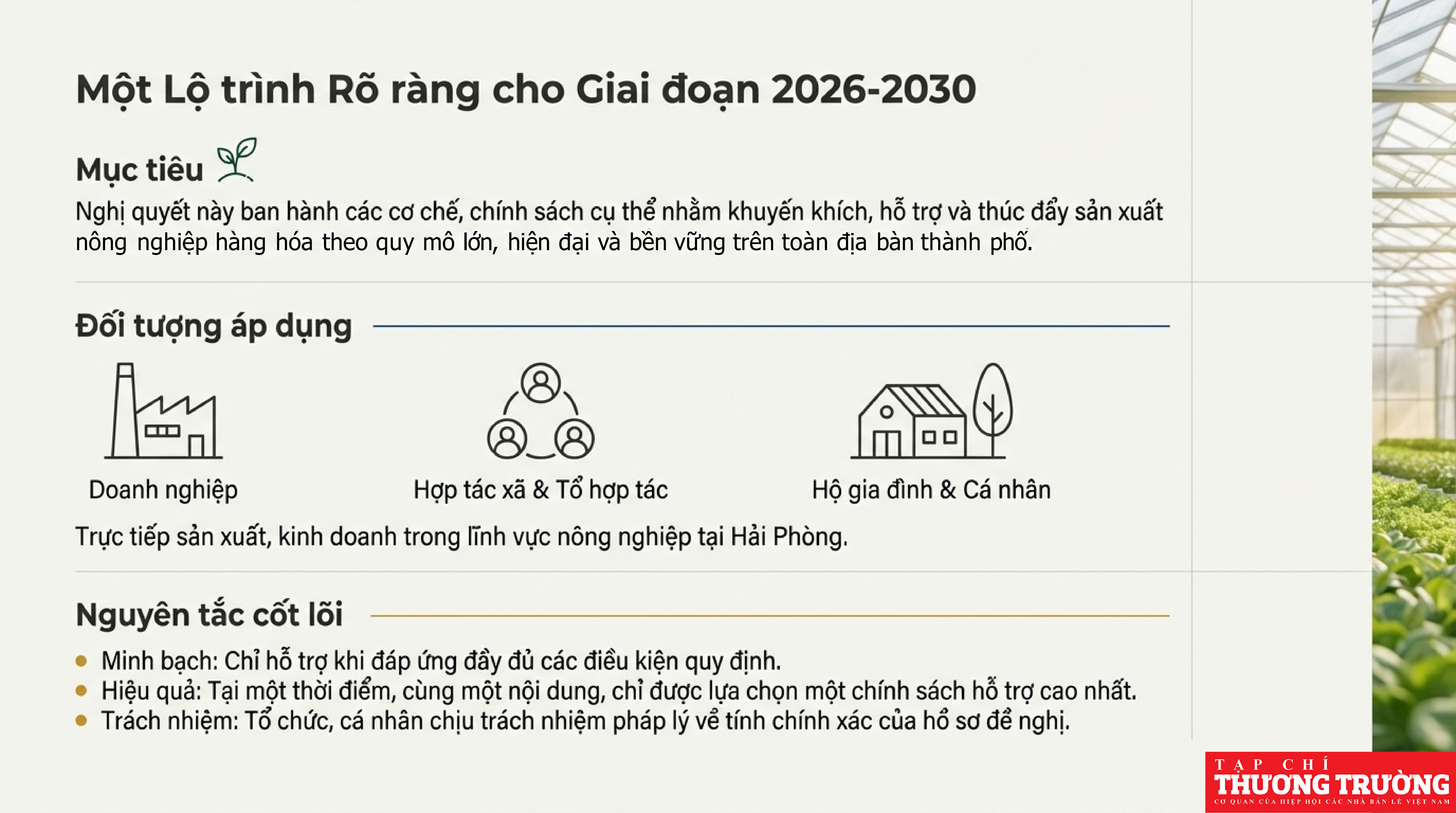 Giai đoạn 2026-2030 là cơ hội để các doanh nghiệp, hợp tác xã và hộ nông dân cùng đồng hành với thành phố, tận dụng chính sách để đầu tư, phát triển và kiến tạo tương lại cho nông nghiệp Hải Phòng.