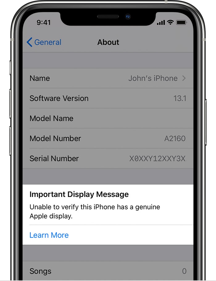 Bắt đầu với các mẫu iOS 13.1 và iPhone 11 (11, Pro và Pro Max), điện thoại của bạn sẽ báo cáo nếu có màn hình của bên thứ ba. Dòng thông báo "Không thể xác minh iPhone này có màn hình chính hãng của Apple" sẽ hiển thị trên màn hình khóa của bạn trong bốn ngày. Sau đó, cảnh báo sẽ xuất hiện trong Cài đặt trong 15 ngày và sau đó trong Cài đặt> Chung> Giới thiệu sau đó.