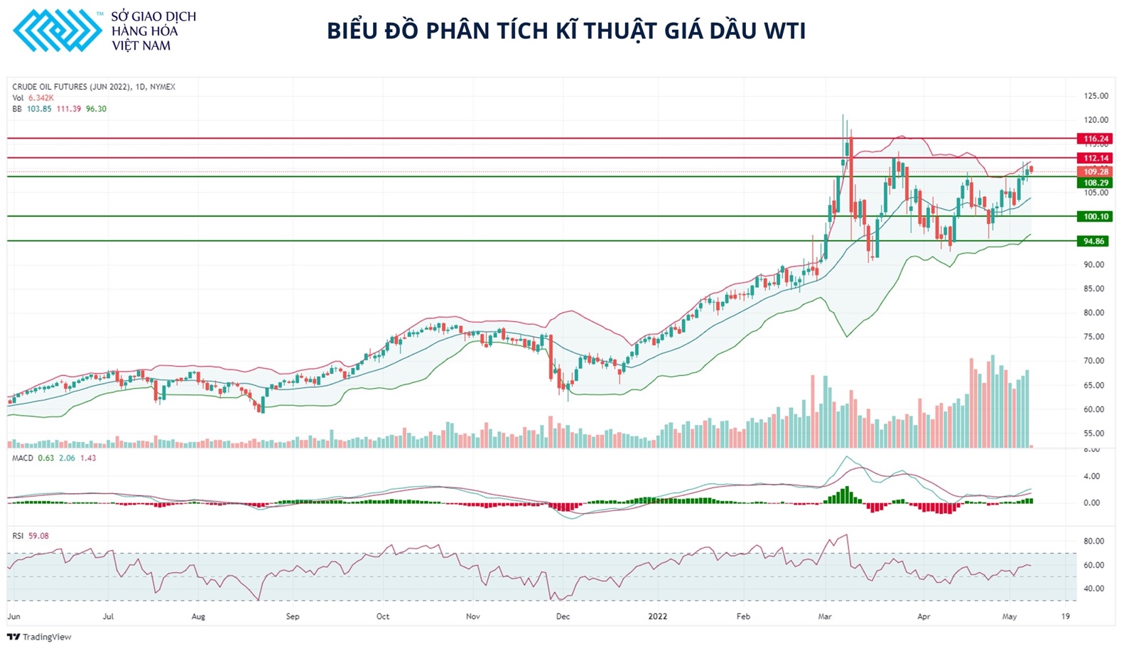 Kết thúc tuần 08/05, giá dầu WTI tăng 4.85% lên 109.77 USD/thùng, trong khi dầu Brent tăng 4.9% lên 112.39 USD/thùng.