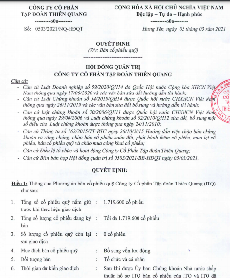 Theo thông tin từ Sở GDCK Hà Nội, CTCP Tập đoàn Thiên Quang (MCK: ITQ) vừa có Quyết định thông qua phương án bán cổ phiếu quỹ.