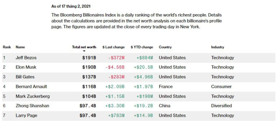 Danh sách các tỷ phú của Bloomberg hôm 17/2