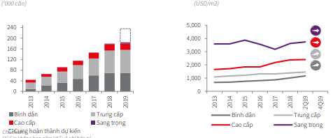 Trong quí III/2019 có khoảng 6.400 căn hộ được chào bán trên thị trường, tăng 8,7% theo quí. Trong số đó, chỉ có 850 căn đến từ 4 dự án mới. Phân khúc cao cấp ghi nhận duy nhất một dự án mới, nằm tại quận Tây Hồ với qui mô 32 căn hộ.