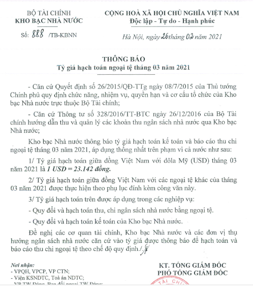 Theo thông báo của Kho bạc Nhà nước, tỷ giá hạch toán kế toán và báo cáo thu, chi ngoại tệ tháng 3/2021 thống nhất trên phạm vi toàn quốc giữa VND với USD là 1 USD = 23.142 VND, tăng 7 đồng so tháng 2/2021